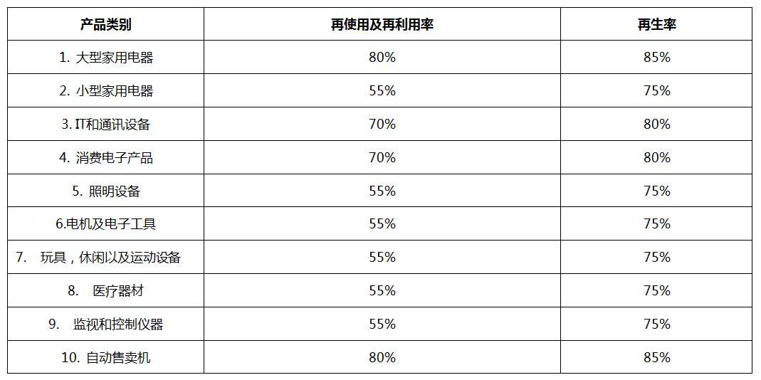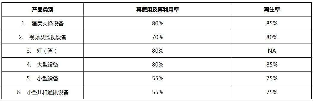 • 所生产的电子电气产品应满足2012/19/EU指令附录Ⅴ设定的最小回收目标(达到规定的再使用、再生利用及回收再利用)