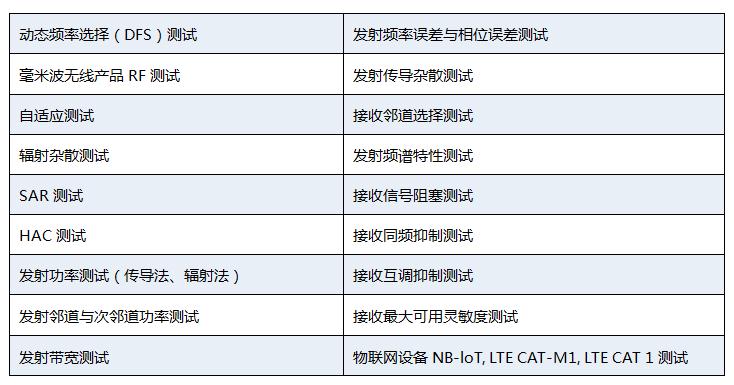 测试标准:EN 300 220-1/-2/-3/-4, EN 300 330, EN 300 440, EN300 328, EN 301 357, EN 301 893, EN 302 502, FCC part 15C, FCC part 15.247, FCC Part 15.407, RSS-210/247/310等。